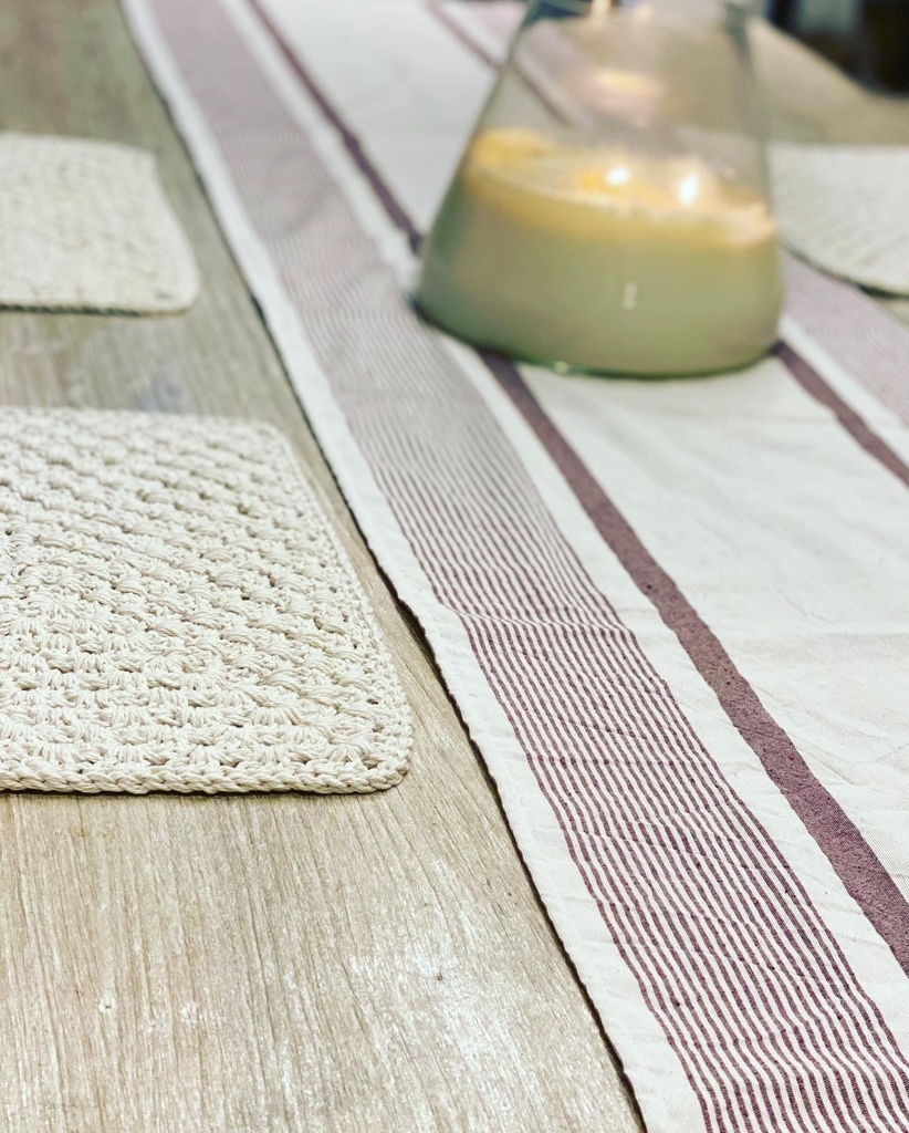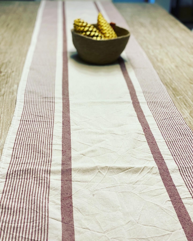Camino de mesa confeccionado en tussor color malva y blanco mide 2.00 x 0.40 mts